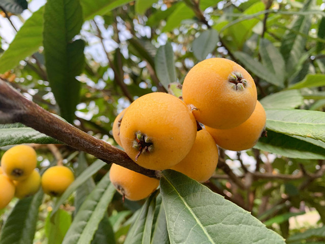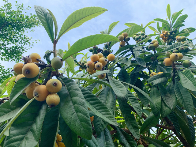 走近枇杷樹的一瞬間,空氣中甜甜的水果香味撲鼻而來,綠油油的枇杷樹葉迎著陽(yáng)光盡情展開著,葉子之間下面鑲嵌著一顆顆成熟金黃的枇杷。
