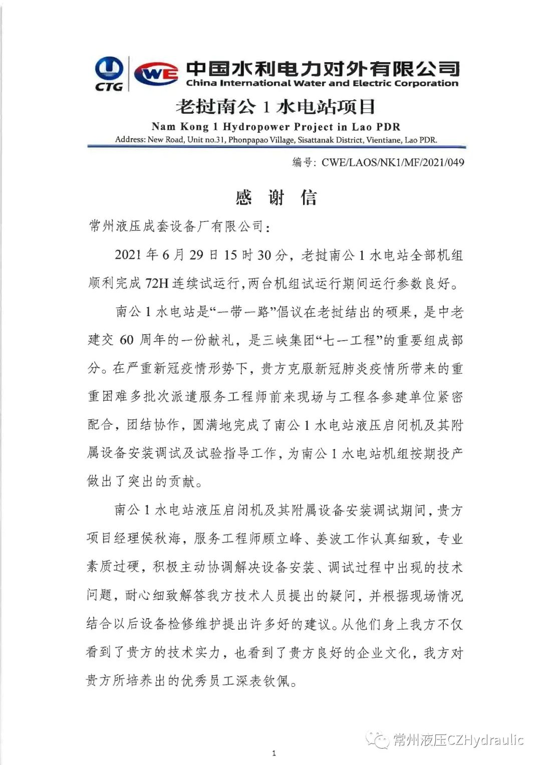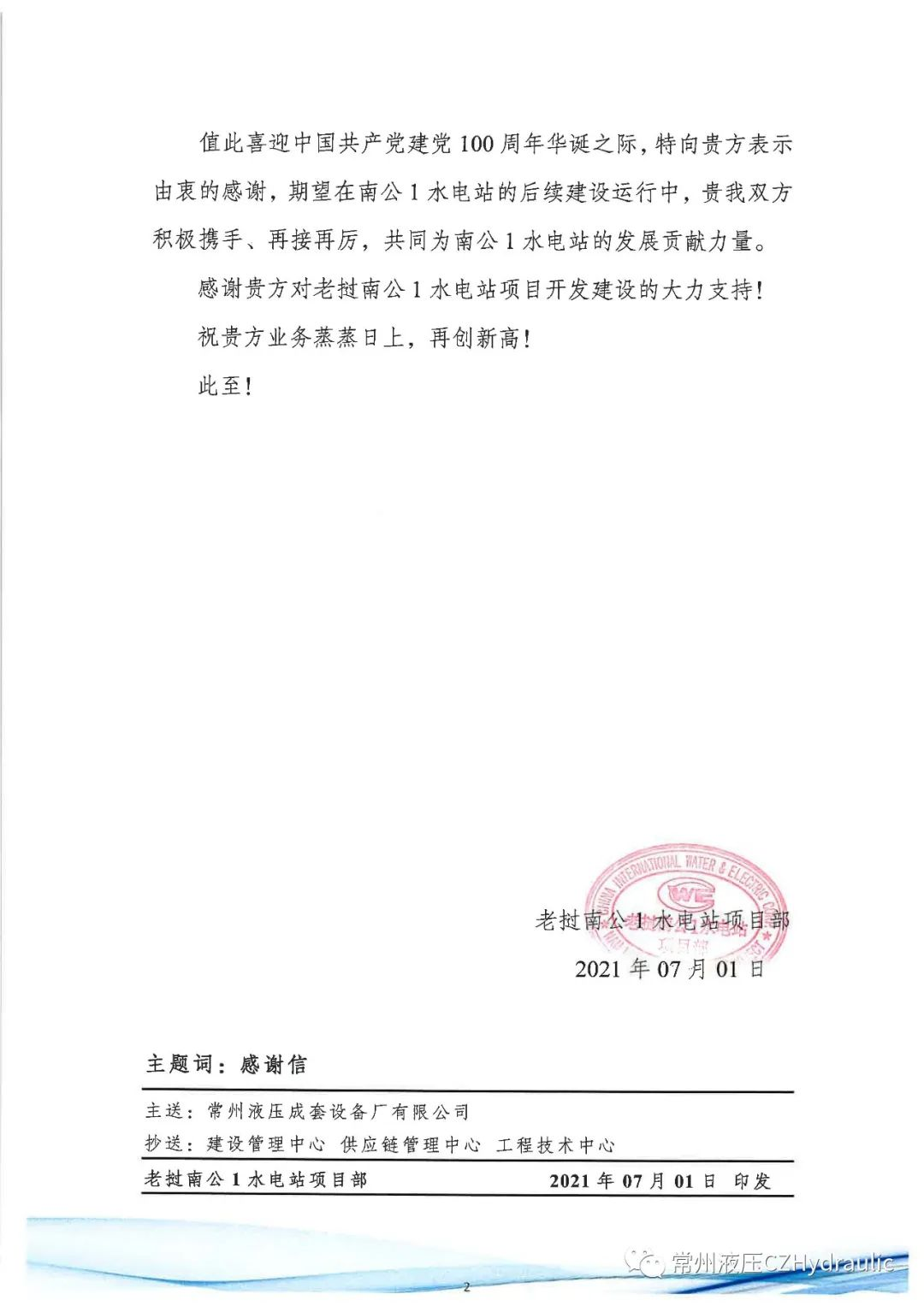 喜迎中國共產(chǎn)黨建黨100周年華誕之際,老撾南公1水電站項目部發(fā)來感謝信,感謝常州液壓在疫情防控期間克服重重困難派遣服務(wù)工程師指導(dǎo)南公1水電站液壓啟閉機及其附屬設(shè)備安裝調(diào)試工作,項目經(jīng)理積極協(xié)調(diào)解決現(xiàn)場問題,保障了南公1水電站機組按期投產(chǎn)發(fā)電!