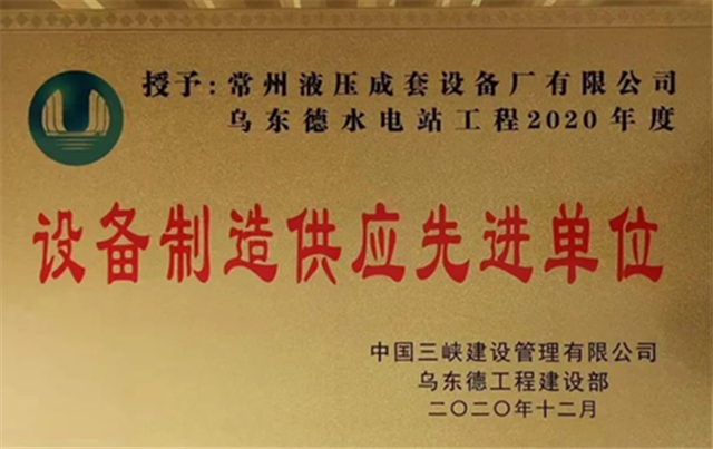 喜訊 | 常州液壓成套設(shè)備廠有限公司榮獲“金沙江金沙水電站2020年度優(yōu)秀制造商”稱號!